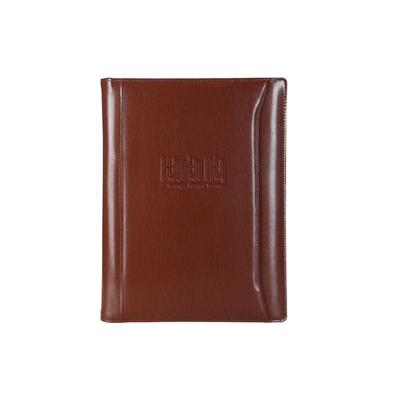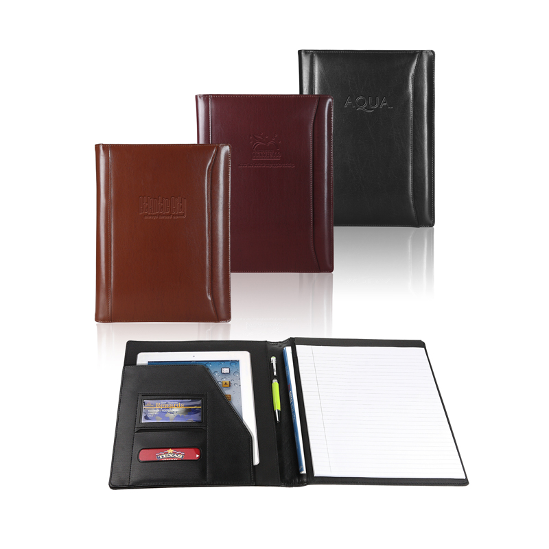 You'll always play your cards "write" when the Atlantis Leather Padfolio is in your campaign! With Tuscan cowhide, genuine leather, this non-zippered padfolio features a pop-up, self-adhering note holder, full-size flap pocket organizer, curved trimmed exterior pocket, I.D. window pocket, elastic pen loop and standard 8 1/2"x11" ruled note pad. The perfect portfolio for meetings, conferences and presentations. Includes Eco Fabric Gift Bag